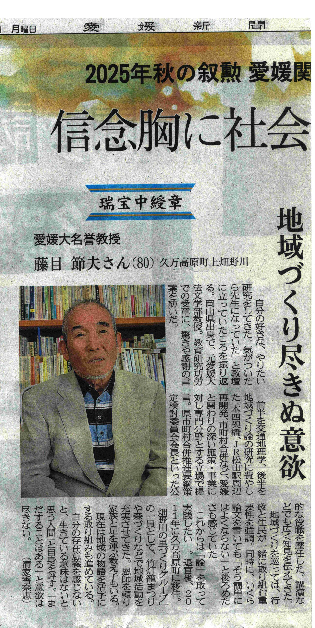 愛媛県市町村合併策定協議会の会長は、愛媛大学教授藤目節夫先生でした。先生は、市町村合併は、コミュニテイーが衰退すると懸念をされておられました。また先生は策定をするに当たり、市町村合併を推進している県の意向に左右されたり、忖度をされることは決してありませんでした。策定協議会を残すところ、後1回のみとなり、しかも間近に迫っていましたが、急いで今回の協議会で結論を出す必要は無い、もう少し議論を深める必要があると自らの信念を決して曲げようとはされませんでした。現在、確かにコミュニテイーの崩壊が大きな問題となっていますので、先生の見解は間違いではなかったと思います。