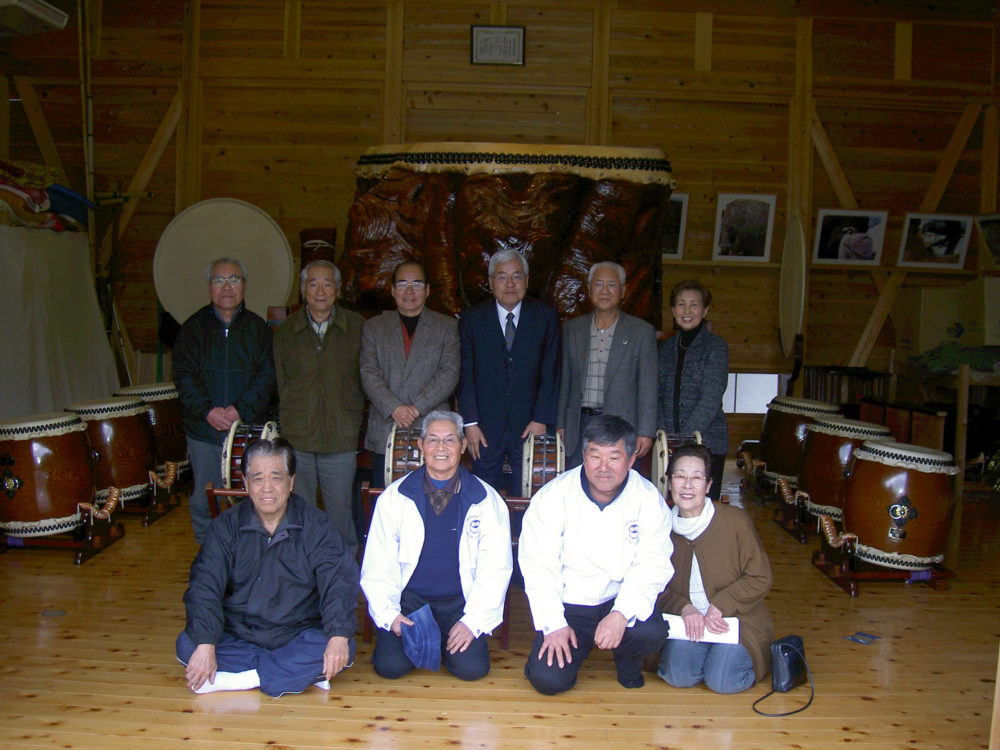 日本一大きい樹根太鼓の前で 打ち合わせ 愛媛県宇和島市津島町 津島やすらぎの里 2014年1月7日 1000 × 750 てんやわんや王国 宇和島市津島町道の駅やすらぎの里に保存されている日本一大きい樹根太鼓の前で撮影。小笠原てんやわんや王国大統領、幹部の皆さん、加藤高浜自治連合会長、島原松山離島振興協会幹部、四之宮。松山観光港のイベントに参加頂くため打ち合わせの会議を開催しました。