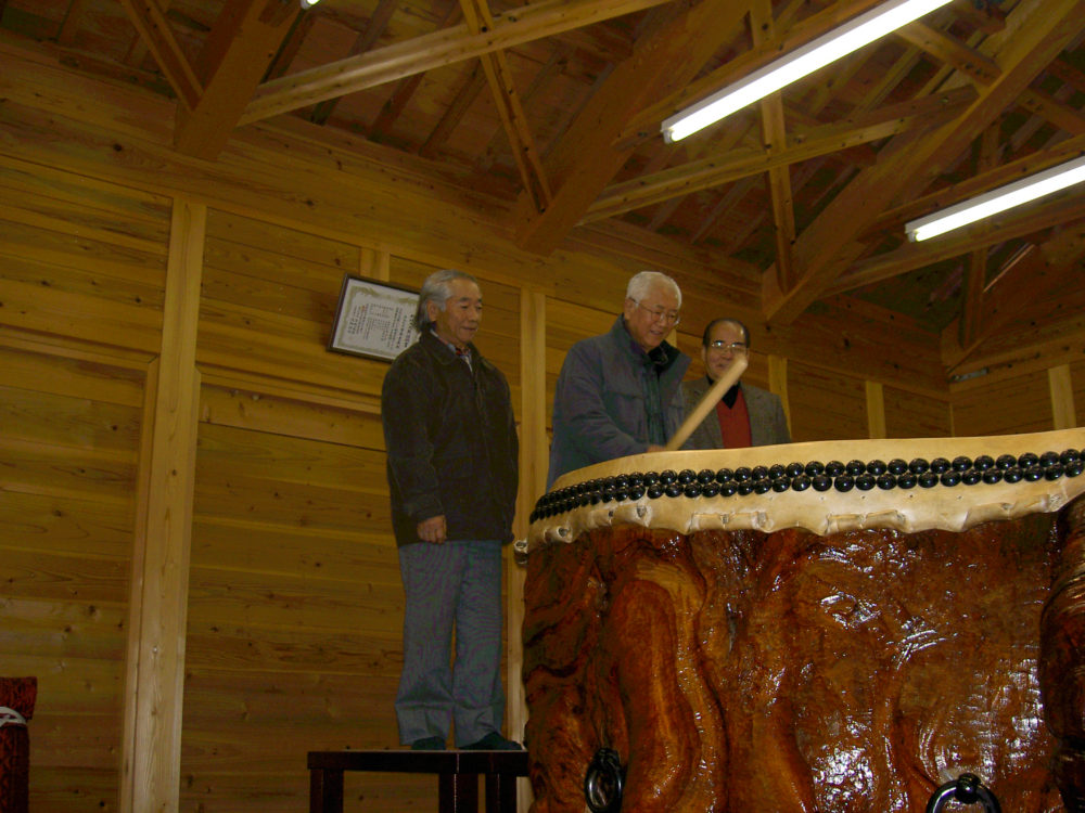 日本一大きい樹根太鼓をたたかせて頂きました。宇和島市津島町やすらぎの里にて