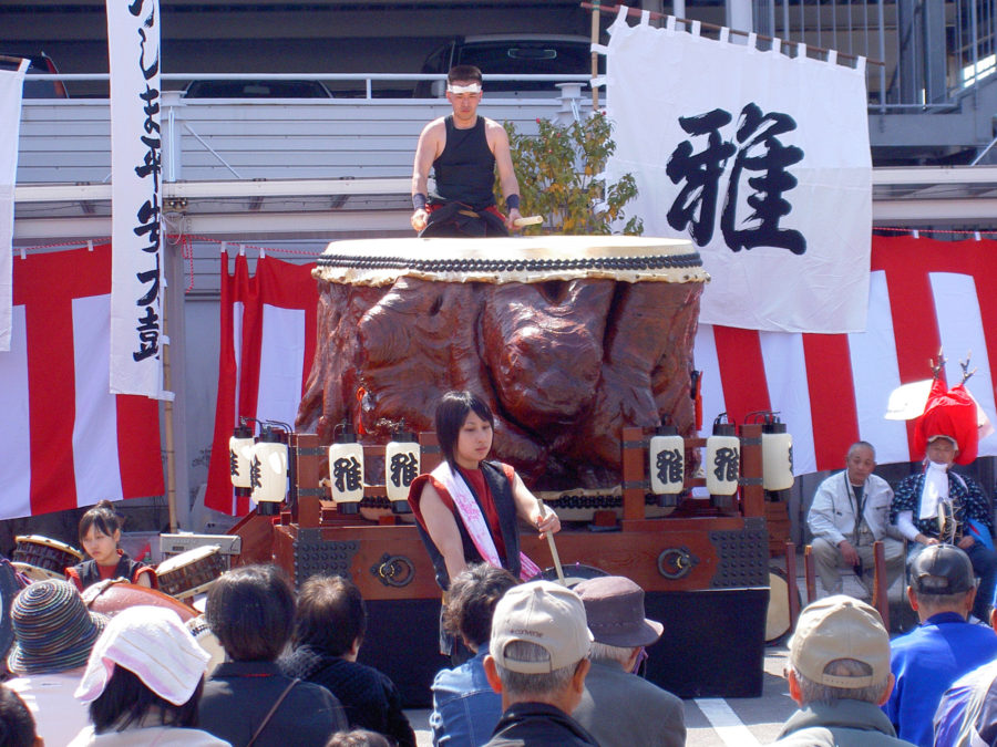 第1回ベンチャーフェア 南予の文化がやって来る 愛媛県松山市松山観光港 2014年1月7日 900 × 675 てんやわんや王国 愛媛県宇和島市津島町の日本一大きい樹根太鼓が松山市高浜の地で豪壮に打ち鳴らされました。この、樹根は津島町に生育していたものです。市町村合併で、津島町の思い出に残るものと製作されました。石川県で製作されたとのことですが、トンネルなど運搬が大変だったそうです。津島から松山観光港までの運搬料がかなりの額になりますが、破格の料金で夢を運んで頂きました。