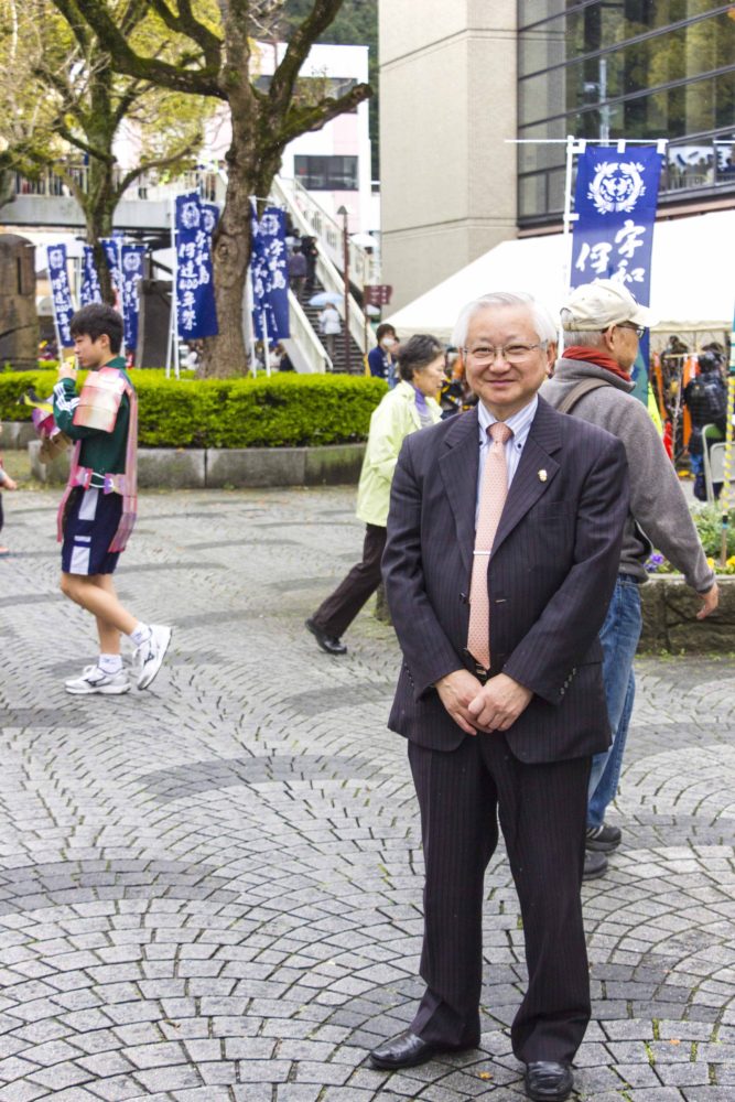 宇和島伊達400年祭 広瀬宇和島商工会議所会頭 2015年3月30日 667 × 1000 元気を頂くツーリング4 写真撮影のポジションを求め、路上橋に向かっていると。広瀬宇和島商工会議所会頭にお会いする。お祝いを述べ、新聞での座談会の記事を見たとお話する。記念写真撮影。