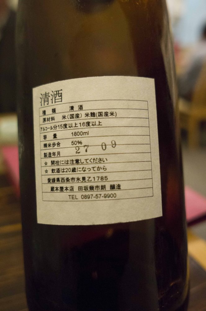 かどや大街道店で飲んだふる里西条市の酒、石鎚、日本心の話をしていると、羽藤君が「西条市に一人で醸造、販売をされているところが有るらしい。なかなか手にいらないそうだ。」と話した。それを飲みたいなと話していると、聞きつけた女性の従業員の方が(実にてきぱきとして気持ちが良い。)店にもあると答えられた。即注文。蔵本屋本店 吟醸酒を冷酒で飲んだ。実に美味い、酒 単独でも美味いのだ。