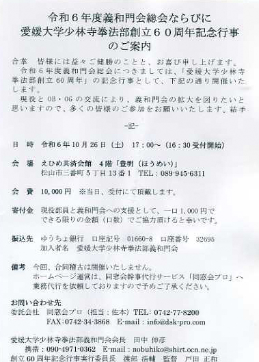 愛媛大学少林寺拳法部創立60周年おめでとうございます。